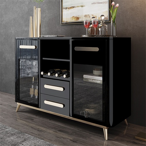 3、備餐柜左右兩邊及上部抽屜和柜門結合的封閉式空間搭配中間可上下調節的酒格設計別出心裁,增大儲物空間的同時更方便您陳列各式美酒;四個支撐腳設計,使備餐柜結構更加穩固。