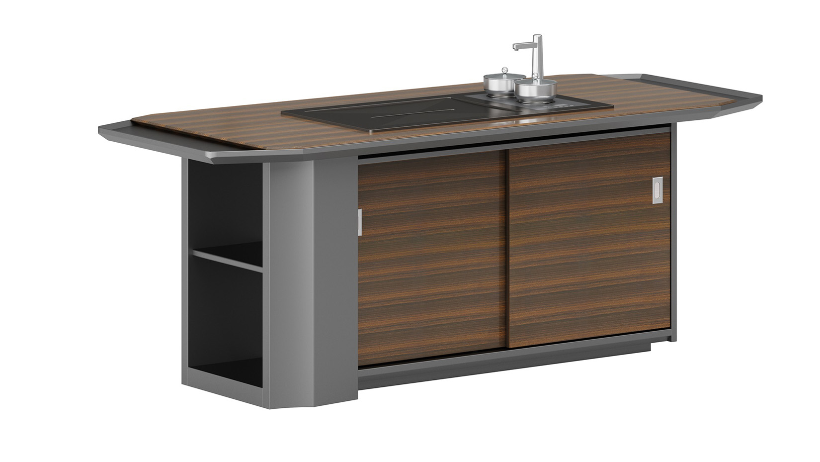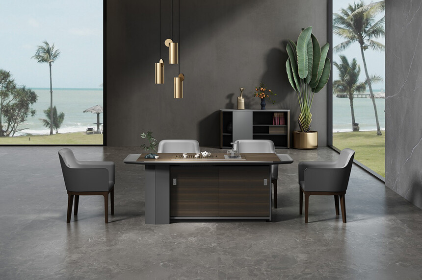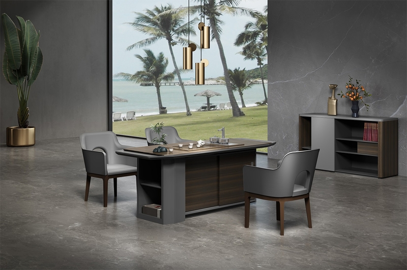 慕格斯將極具立體感的主色煙熏尤加利與星空灰輔色立體結合,相互依襯,為辦公空間平添意趣;整體采用高科技制作工藝,多面切割,塑造線條,立體感和科技感強烈。