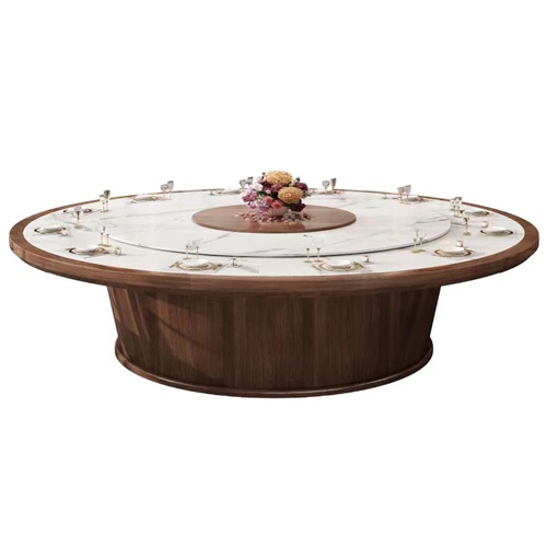 片尺寸價格說明定做服務。這款酒店新中式16人電動餐桌采用高質量的木材和大理石臺面制造,實木表面涂裝采用了中國傳統的漆藝技術,使其具有較好的耐用性和美觀性。電動餐桌采用先進的電動機和智能控制系統,可以實現快速、平穩的轉動調節,滿足不同場合的使用需求。