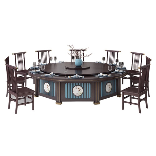 。這款會所包間新中式實木電動餐桌自動轉盤大圓桌是由經典的深棕色與藍色搭配。轉盤和桌面的顏色與圍板的顏色都設計為一體色彩,讓電動餐桌上下更加呼應,圍板噴藍色,承重柱子采用了金色不銹鋼裝飾,簡潔大方,深受客人們的喜愛。