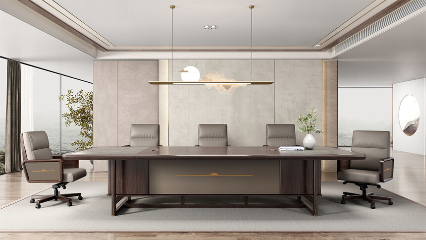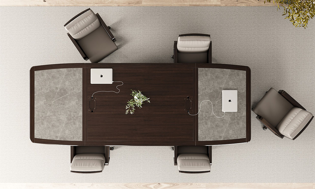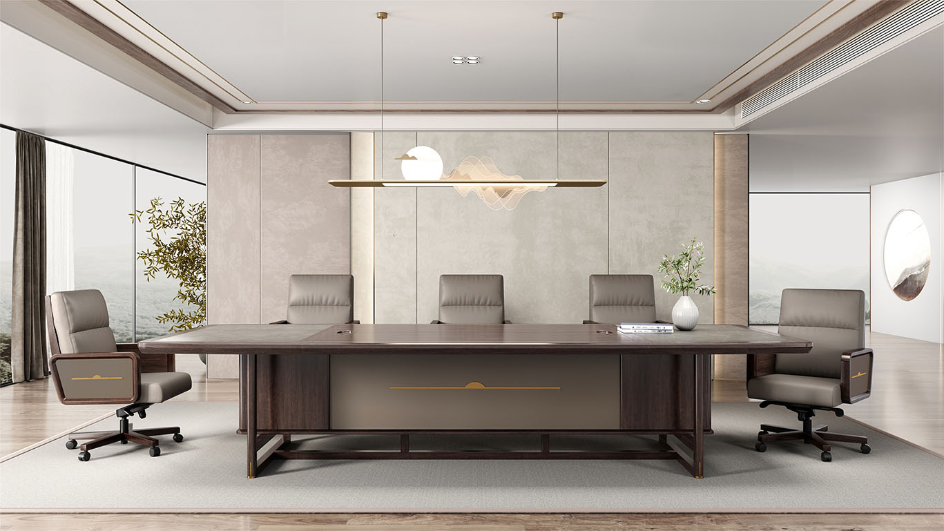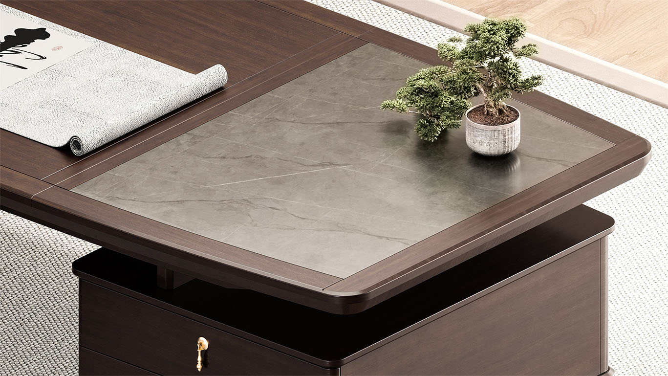 鴻泰系列是一款新中式風格的辦公家具,設計靈感源于中式傳統裝飾紋樣“回”字形,因其形式回環反復,延綿不斷,在民間有“富貴不斷頭”的說法,有連綿不斷、吉利長久的吉祥寓意,在造型上主要采用硬朗簡潔的直線條,溫潤的烏金木與質樸的巖板相結合,剛柔并濟,時尚大方,既使得中式家具古典、質樸的內涵顯現,又符合現代辦公追求的時尚感、實用性。