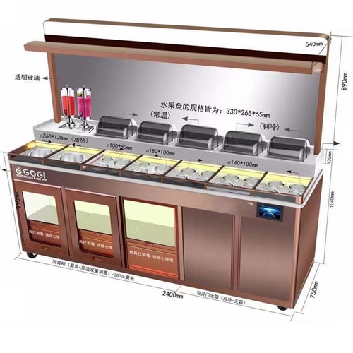 以滑蓋保鮮、風冷保鮮、高溫+臭氧消毒功能,解決了醬料在常溫下開放式存放、碗碟露天存放等食安隱患問題;運用強大的智能操控系統,讓調料區管理更高效;支持多種功能、風格定制,打造餐企專屬料臺。