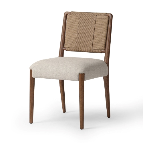 餐廳家具廠家為您展示咖啡廳軟包座墊麻繩靠背實(shí)木餐椅