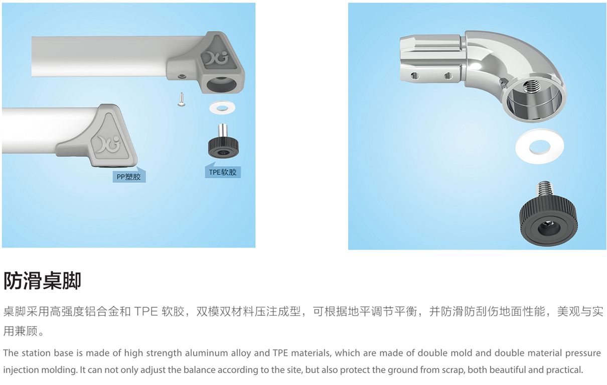 5.桌腳掌:1.8mm壁厚,腳套底有4個平衡調節機構。