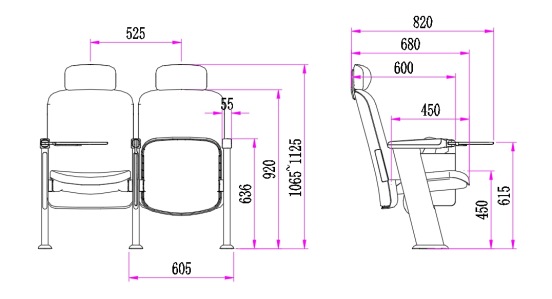 2.座椅基本中心距為525±5mm,座包打開側(cè)深680±5mm,寫字板打開側(cè)深820±5mm,基本椅高不帶頭枕為920±5mm、帶頭枕為1065~1125±5mm,最小排距:850mm。