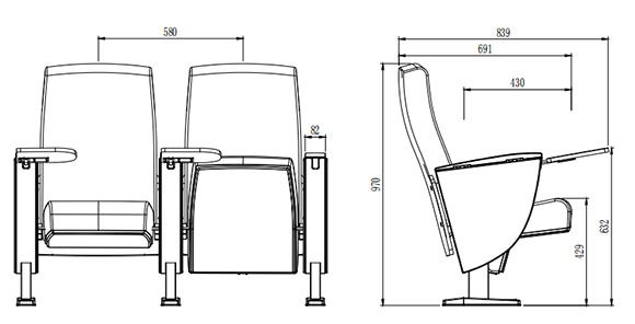 2.座椅基本中心距為580±10mm,座包打開側深691±10mm,寫字板打開側深839±10mmm,基本椅高為970±10mm。最小排距:900mm。通過相關家具產品質量檢驗中心QB/T2602-2013《影劇院公共座椅》的相關檢測依據,甲醛釋放量≤0.120mg/m³h;抗引燃特性符合GB17927.1-2011中的要求。