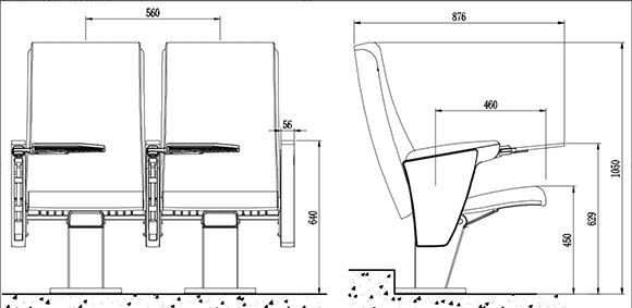 2.座椅基本中心距為560±5mm,座包打開坐深460±5mm,寫字板打開側深876±5mm,基本椅高為1050±5mm,最小排距:900mm。