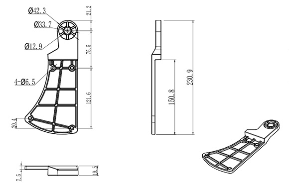 12.站腳:托板采用優質鋁合金材料經模具一體壓鑄成型,腳管采用優質方管,腳筒為優質鋼板,經模具壓制后用二氧化碳焊接成型,外形為單腳下通風結構裝置,表面經過除銹、清洗、氧化、烘干、靜電、高溫、靜噴亞光黑處理,尺寸規格:長度為495±2mm,寬度為285±2mm,高度為300±2mm。
