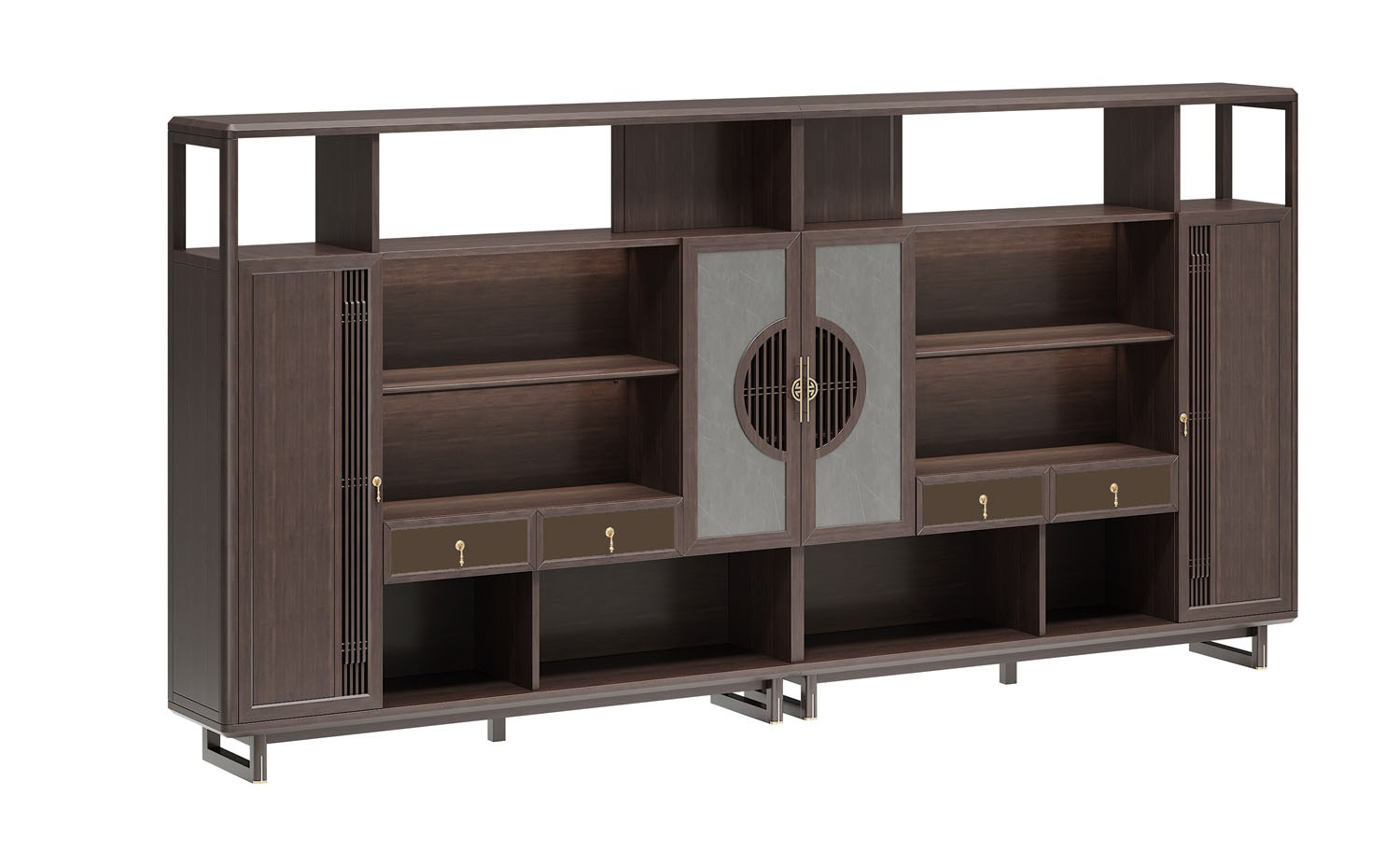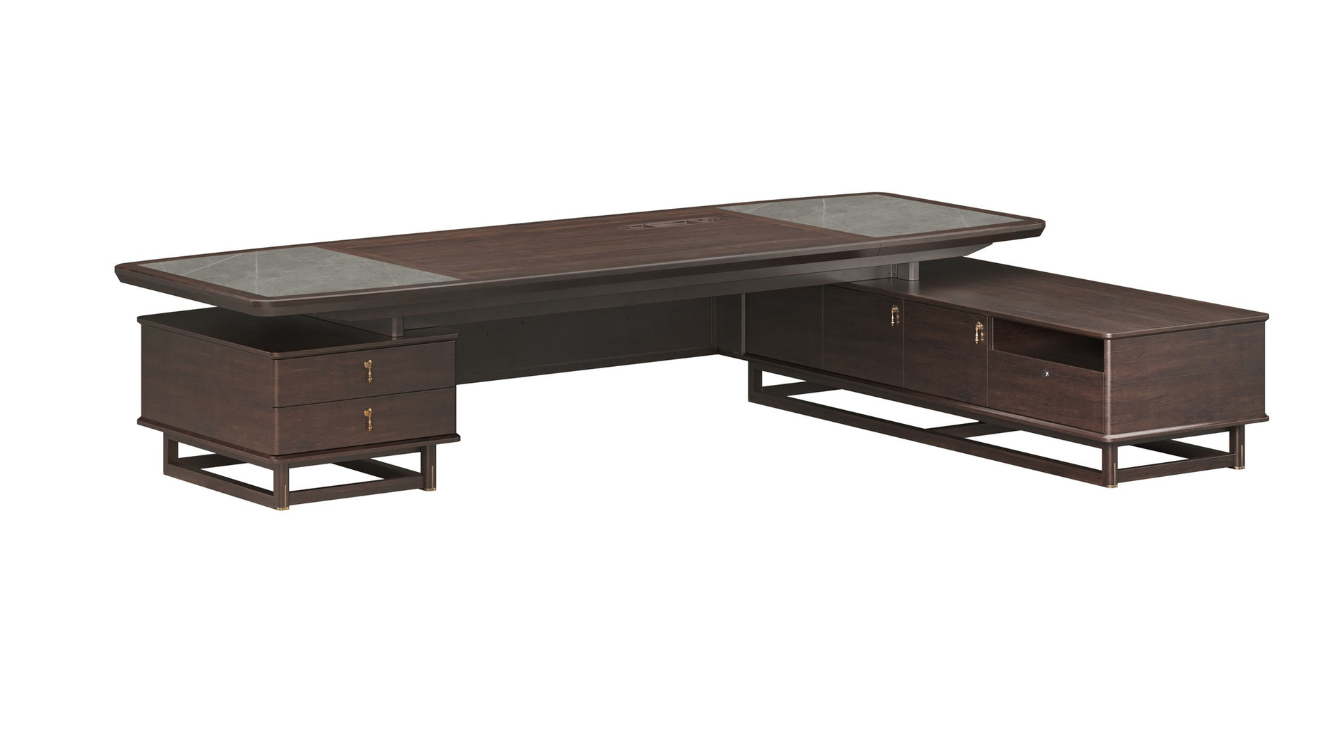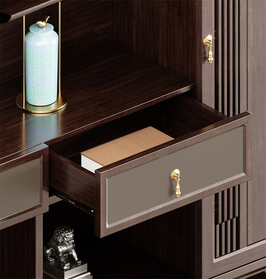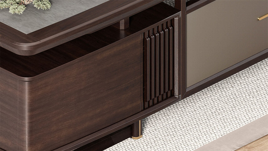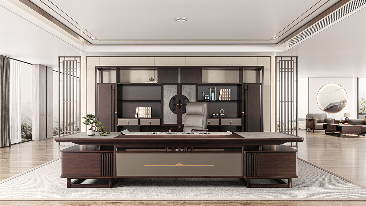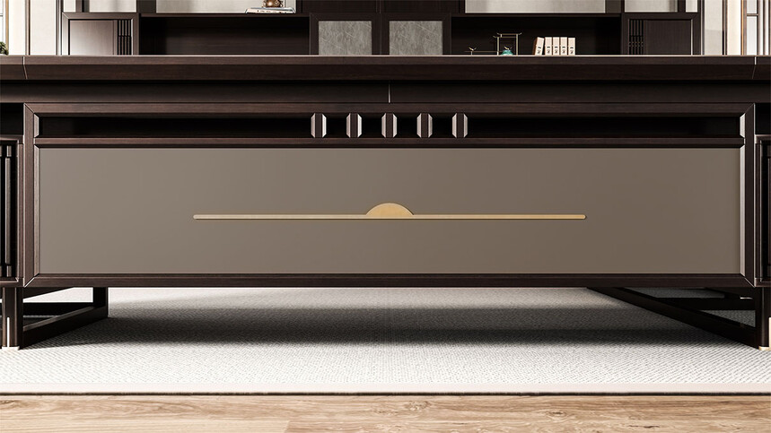 鴻泰系列是一款新中式風格的辦公家具,設計靈感源于中式傳統裝飾紋樣“回”字形,因其形式回環反復,延綿不斷,在民間有“富貴不斷頭”的說法,有連綿不斷、吉利長久的吉祥寓意,在造型上主要采用硬朗簡潔的直線條,溫潤的烏金木與質樸的巖板相結合,剛柔并濟,時尚大方,既使得中式家具古典、質樸的內涵顯現,又符合現代辦公追求的時尚感、實用性。