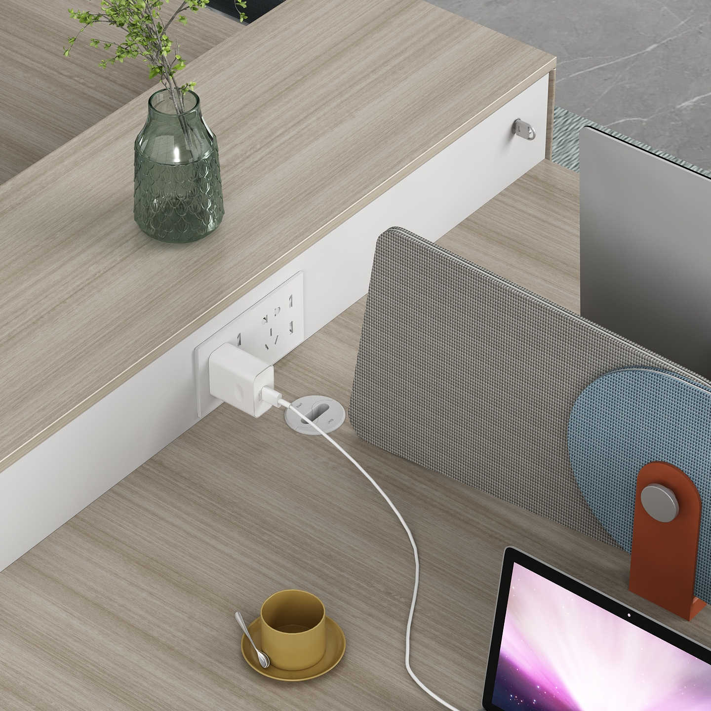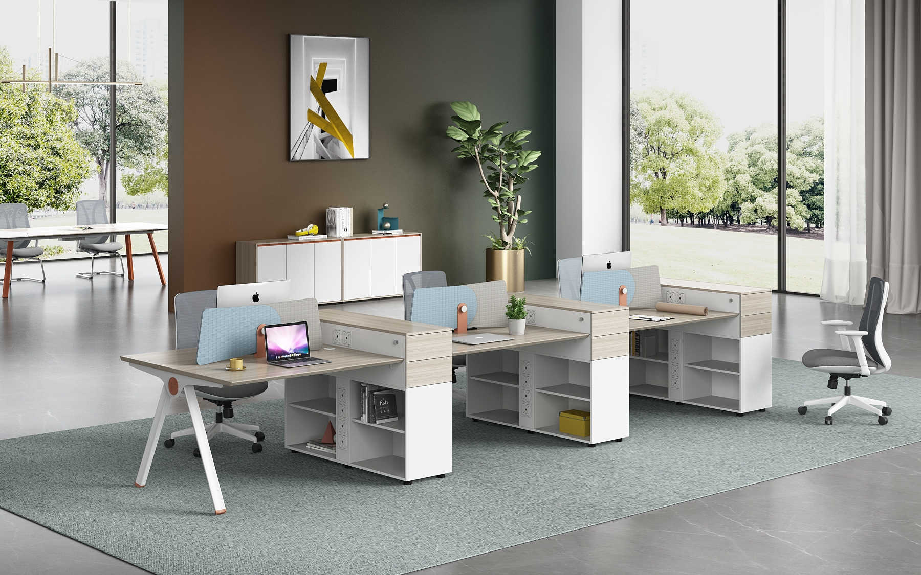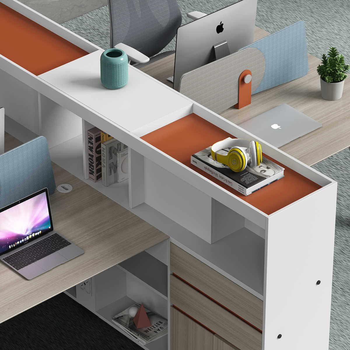 優格又名“有格”,代表了有品格、有格調。產品整體以“青春、時尚、動感”為設計主題,采用了大量的弧形與直線條交叉設計,將產品魅力展示的淋漓盡致。在一貫沉穩的深色辦公配色中,大膽運用了白色、卡其棕色與淺色木紋的撞色搭配,打破產品配色原有的嚴肅氛圍,賦予了產品生命力以及活力。獨特的臺腳與桌屏設計,動感十足,無不展示產品的細節之美。產品設計時尚,配置齊全,適合各種規模的辦公場所。